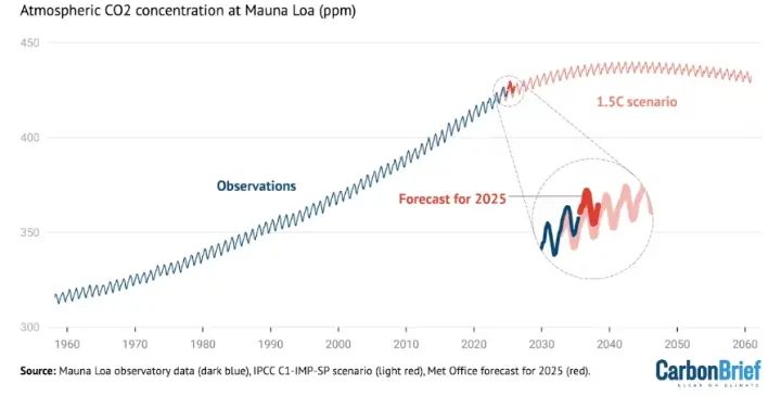 The year 2024 will be remembered as a critical juncture in the fight against climate change. Atmospheric CO2 levels at the Mauna Loa Observatory spiked by an unprecedented 3.58 parts per million (ppm), marking the fastest annual increase ever recorded (see Figure 1: Atmospheric CO2 Concentration at Mauna Loa (ppm)). This sharp rise, driven by fossil fuel combustion, devastating wildfires, and weakened natural carbon sinks like forests, pushed global temperatures dangerously close to the 1.5°C threshold outlined in the 2015 Paris Agreement.